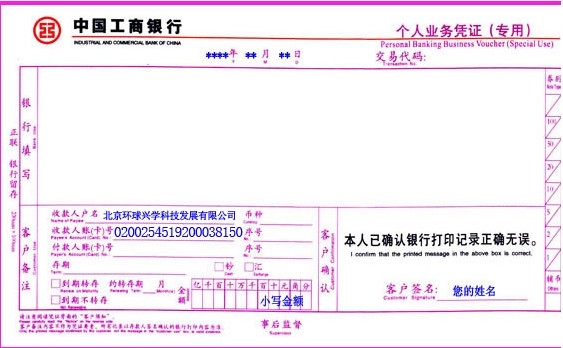 收款單位:北京環(huán)球興學(xué)科技發(fā)展有限公司(用戶需提醒銀行人員切勿寫錯,切記!)