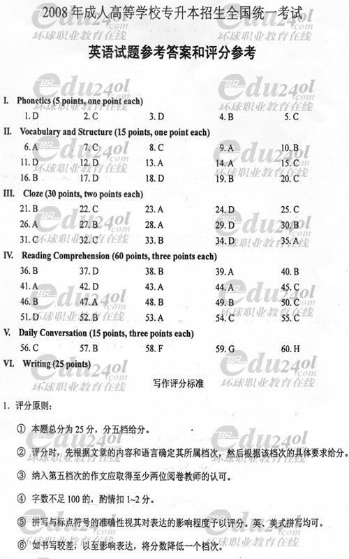 2008年成人高考專升本英語(yǔ)試題答案