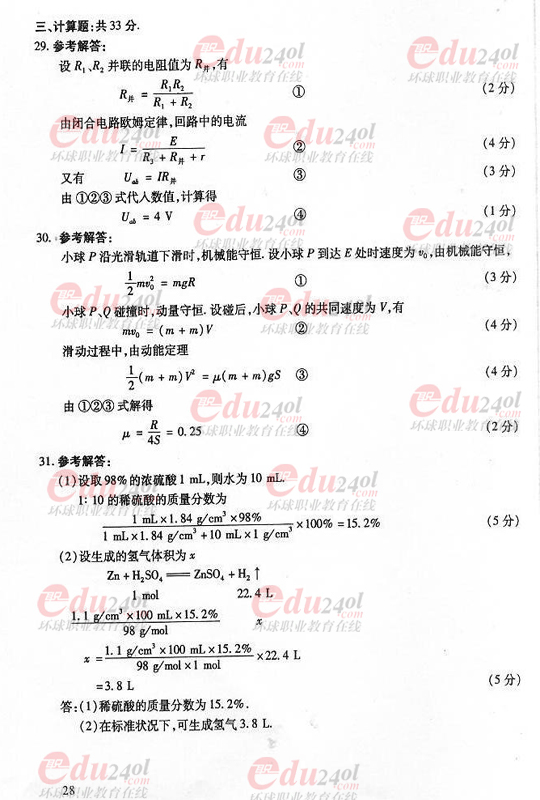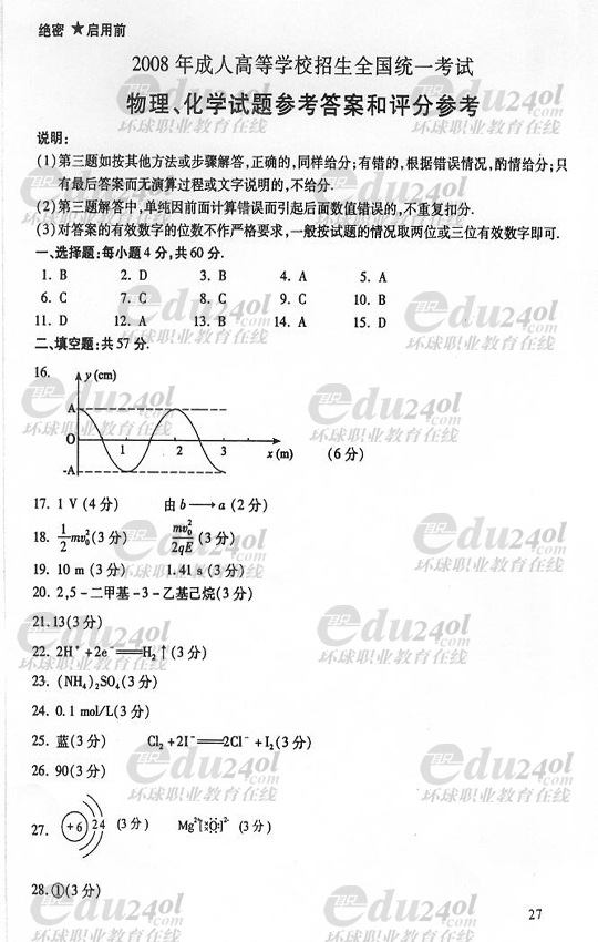 2008年成人高考高起點(diǎn)物理化學(xué)試題答案