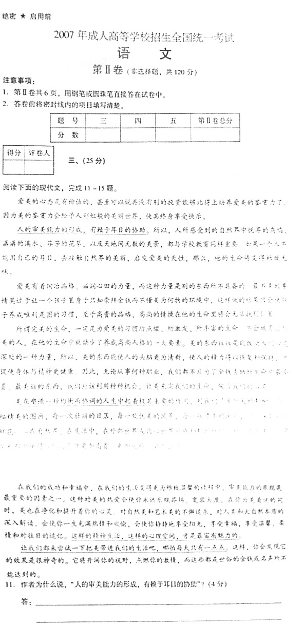 2007年成人高考高中起點《語文》試題及答案