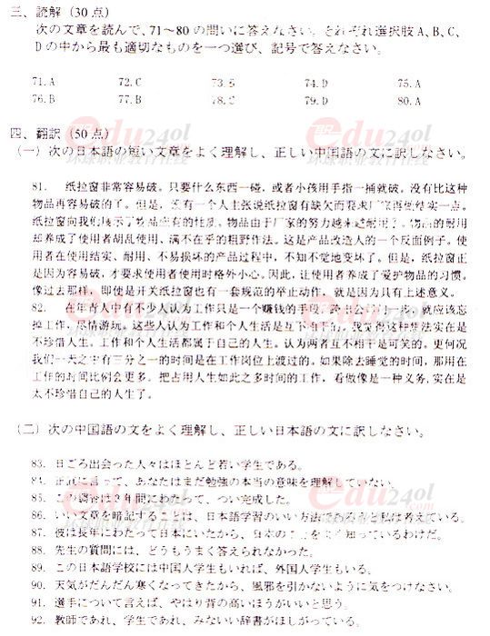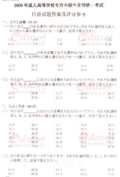 2009年成人高考專升本日語參考答案