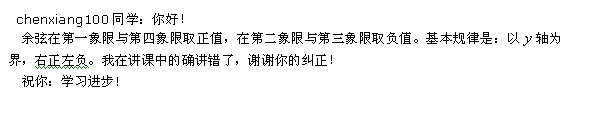 老師您好,在數(shù)學班第九講中最后幾分鐘,余弦在第四象限的符號您講的有誤,應(yīng)為正值。