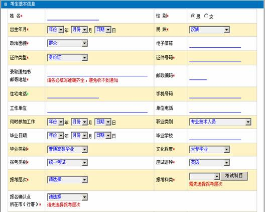 單擊“新用戶”按鈕,認真閱讀《考生守則》、《國家教育考試違規(guī)處理辦法》。點擊“我了解”,進入“考生基本信息”頁面,詳細填寫考生信息。對于生僻字,考生可以先輸入拼音,報名確認時,向招考辦工作人員作出說明。