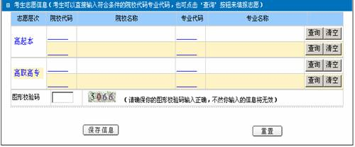 志愿填報有兩種方式:考生可以直接輸入符合條件的院校代碼和專業(yè)代碼;也可通過點擊“查詢”按鈕,使用“專業(yè)代碼選擇工具”來填報志愿,單擊已選定專業(yè)行的“選擇專業(yè)”按鈕,即可。