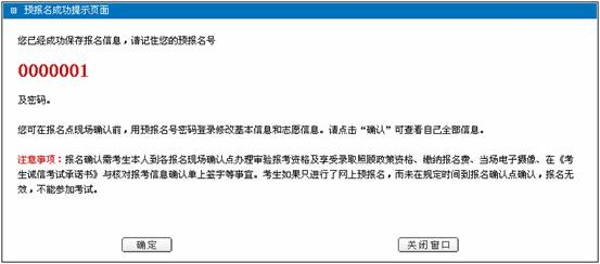 志愿信息填報完成后,輸入圖形校驗碼,點擊“保存信息”,保存成功后出現(xiàn)“信息錄入成功”提示頁面。此時系統(tǒng)將向您提供您的網(wǎng)上預報名號,這是您以后登錄、瀏覽、修改網(wǎng)上報名信息以及現(xiàn)場報名點確認的唯一標識,務必請牢記您個人的預報名號和密碼。