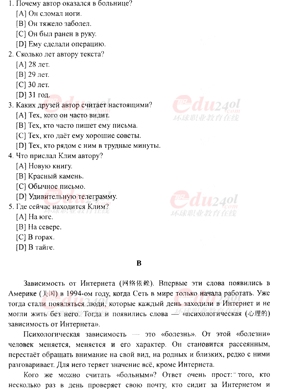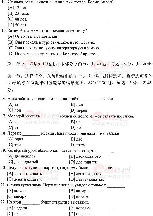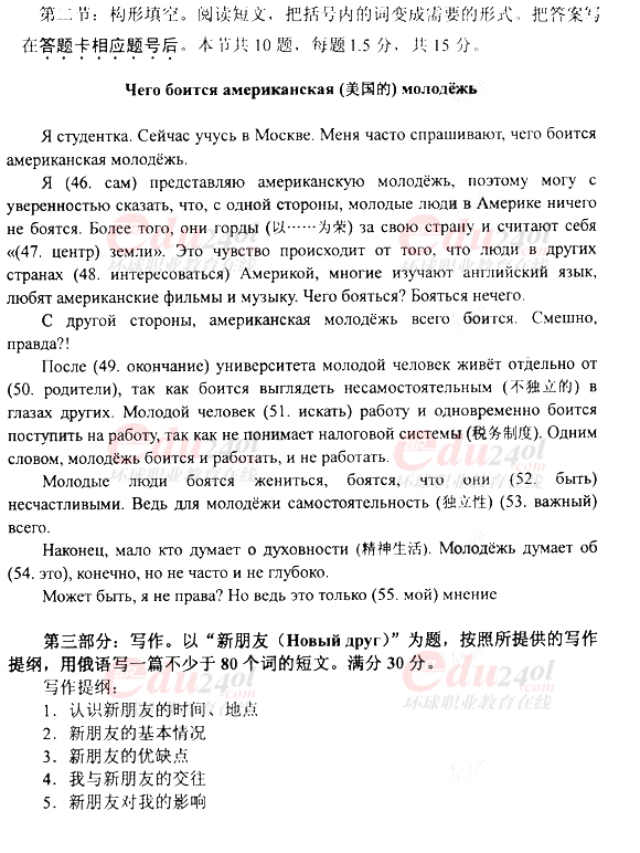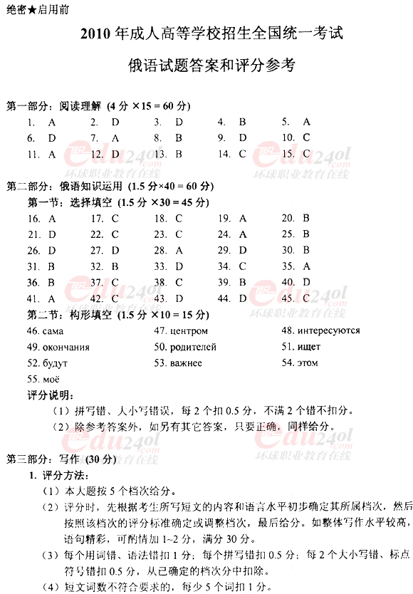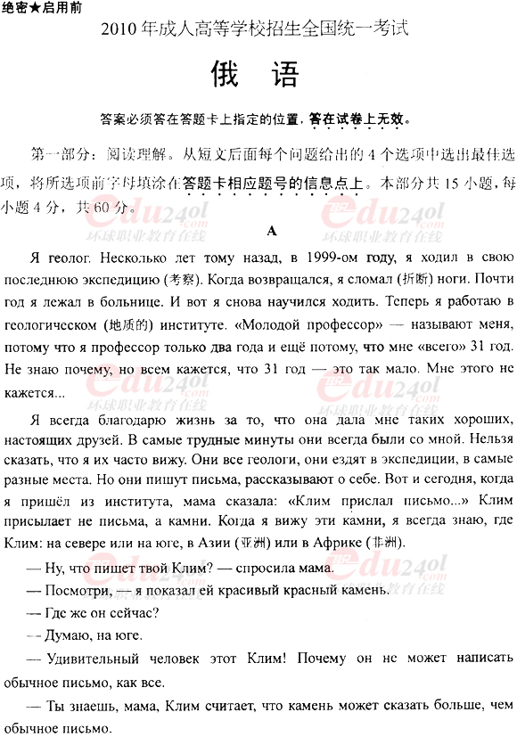 2010年全國(guó)成人高考高起點(diǎn)俄語(yǔ)真題及答案