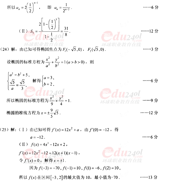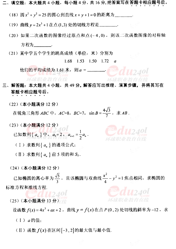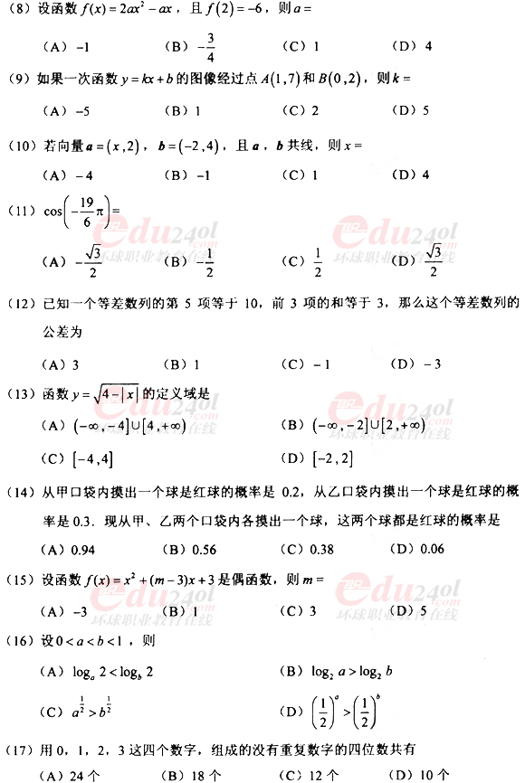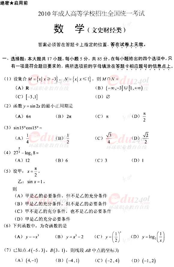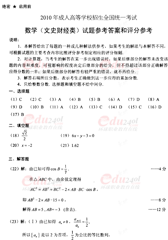 2010年全國(guó)成人高考高起點(diǎn)數(shù)學(xué)(文)真題及答案