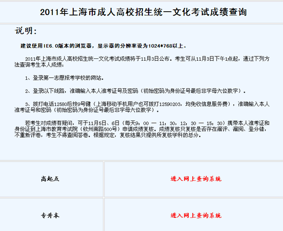 點(diǎn)擊進(jìn)入>>上海2011年成人高考成績查詢?nèi)肟?/FONT> (入口將在11月3日下午1點(diǎn)開通)
