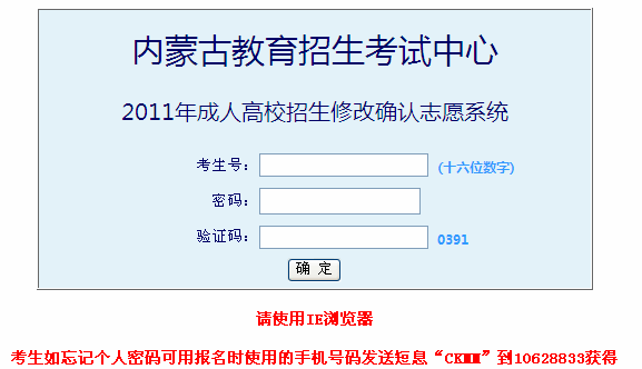 點(diǎn)擊進(jìn)入>>內(nèi)蒙古2011年成人高考修改確認(rèn)志愿系統(tǒng)