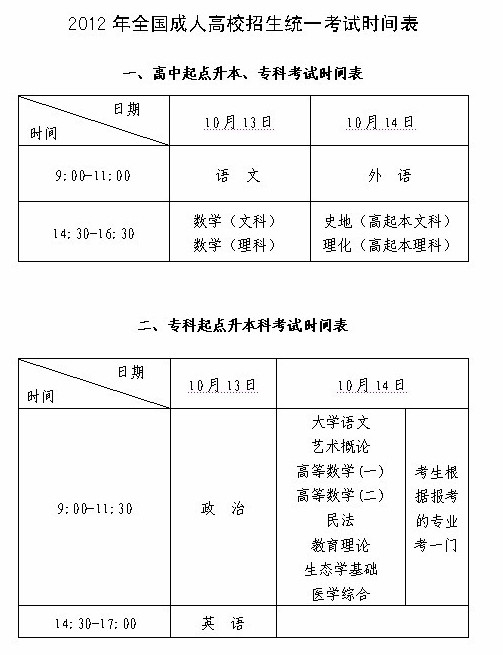 福建2012年成人高校招生統(tǒng)一考試時間表