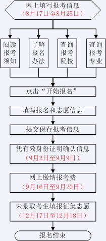 一、考生網(wǎng)上報(bào)名時(shí)間是8月17日至8月25日,每天8:30至17:00;考生網(wǎng)上報(bào)名的同時(shí)填報(bào)一志愿。網(wǎng)址:山東省教育招生考試院網(wǎng)站(http://www.sdzk.gov.cn)或http://crbm.sdzk.gov.cn/。