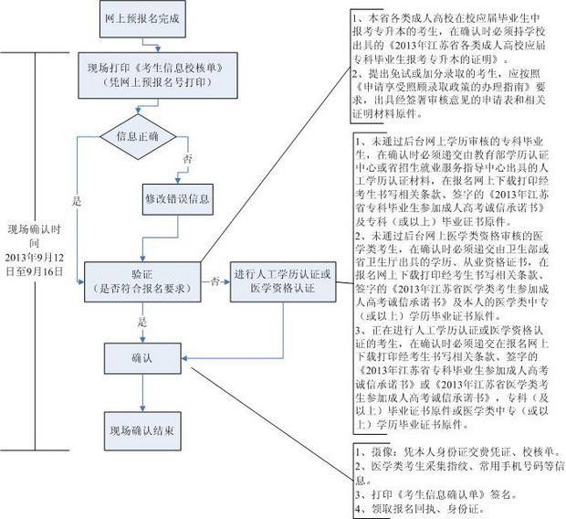 江蘇省2013年成人高考現(xiàn)場(chǎng)確認(rèn)流程圖