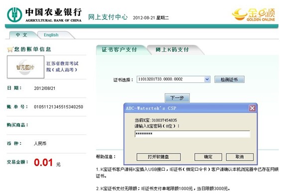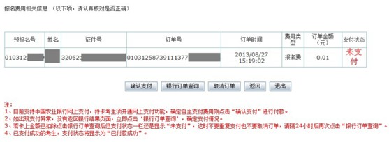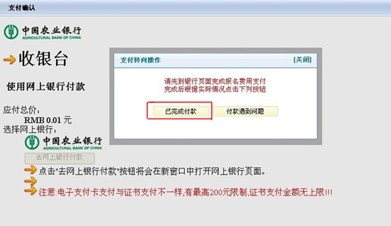 1.僅支持中國(guó)農(nóng)業(yè)銀行網(wǎng)上支付,持卡考生須開通網(wǎng)上銀行功能,支付費(fèi)用點(diǎn)擊“確認(rèn)支付”進(jìn)行付款。
