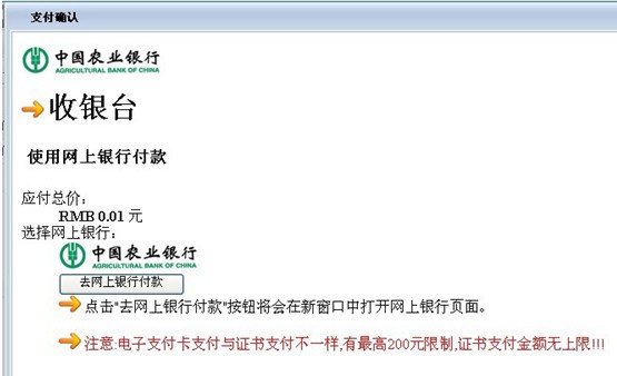 4.點(diǎn)擊“去網(wǎng)上銀行付款”,系統(tǒng)將跳轉(zhuǎn)到農(nóng)行支付網(wǎng)站。按照網(wǎng)站提示步驟完成網(wǎng)上支付。如圖 4和圖 5。