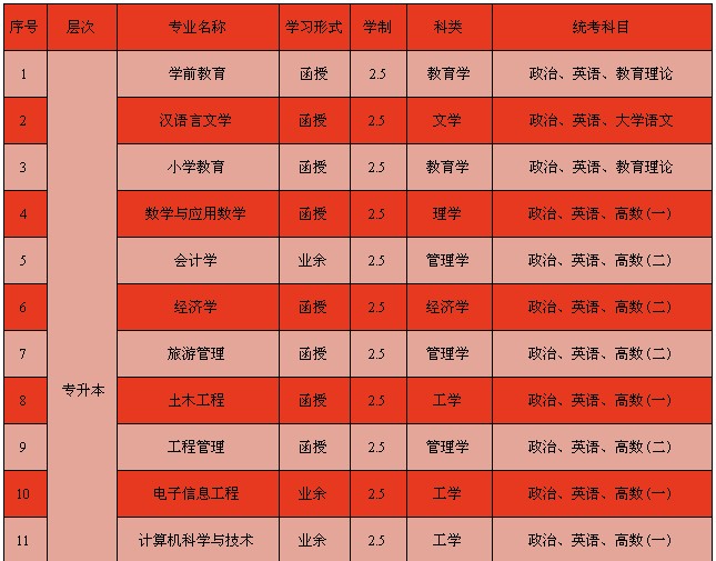 11、計(jì)算機(jī)科學(xué)與技術(shù)(專升本,學(xué)制2.5年。授予學(xué)位:工學(xué)學(xué)士)