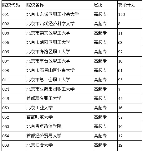 2013年北京市成人高校招生第二批高中起點??茖哟武浫∫延?2月20日下午17:00結束??忌稍?2月21日8:00以后登錄北京教育考試院網(wǎng)站(www.bjeea.edu.cn或www.bjeea.cn)查詢第二批次錄取結果。未被錄取的線上考生(過最低控制分數(shù)線的考生)請在12月21日8:00―12月23日17:00登錄北京教育考試院網(wǎng)站線上調(diào)劑平臺(http://bjczwsbm.bjeea.cn)重新填報志愿,逾期不予補報??蓞⒓泳€上調(diào)劑的院校余缺計劃信息如下: