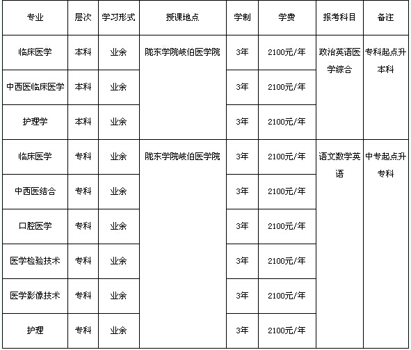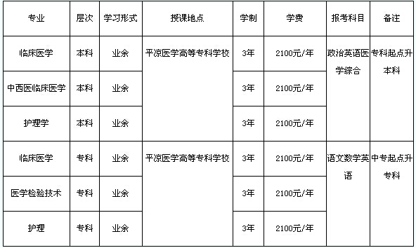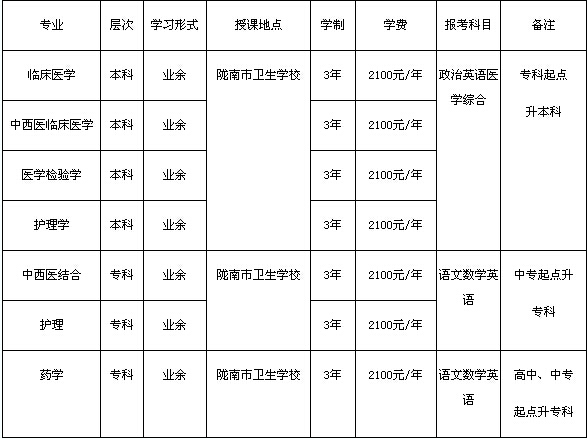 目前我院成人高等教育專升本有:中醫(yī)學(xué)、臨床醫(yī)學(xué)、醫(yī)學(xué)影像學(xué)、中西醫(yī)臨床醫(yī)學(xué)、醫(yī)學(xué)檢驗(yàn)學(xué)、口腔醫(yī)學(xué)、護(hù)理學(xué)、中藥學(xué)8個(gè)專業(yè)。專科有:中醫(yī)學(xué)、中西醫(yī)結(jié)合、臨床醫(yī)學(xué)、護(hù)理、醫(yī)學(xué)檢驗(yàn)技術(shù)、醫(yī)學(xué)影像技術(shù)、口腔醫(yī)學(xué)、針灸推拿、藥學(xué)9個(gè)專業(yè)。