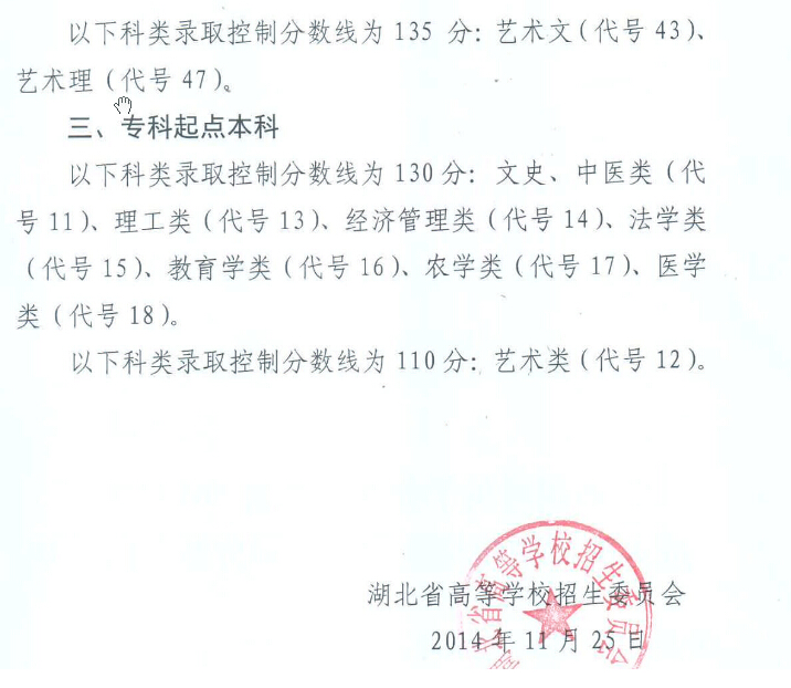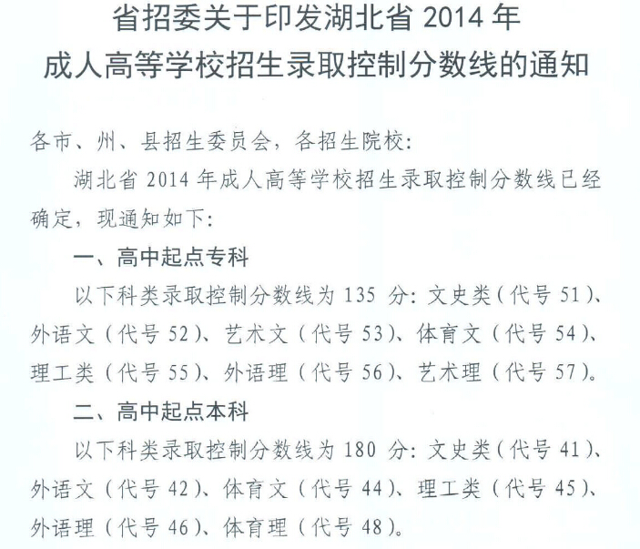 湖北省2014年成人高考招生錄取控制分?jǐn)?shù)線