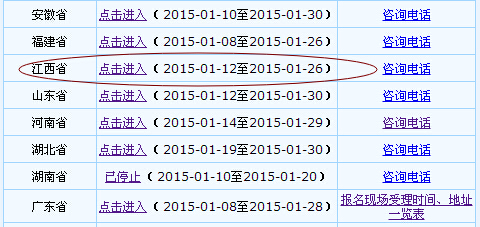 江西省2015年初級會計(jì)職稱網(wǎng)上報(bào)名時(shí)間為1月12日-26日,請登陸江西省財(cái)政廳綜合信息網(wǎng)(http://www.jxf.gov.cn)或江西會計(jì)網(wǎng)(http://acc.jxf.gov.cn)會計(jì)專業(yè)技術(shù)資格考試報(bào)名入口。