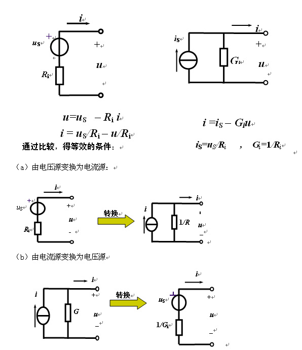 (a)變換關系:數(shù)值關系: iS=uS /Ri;Gi=1/Ri,方向:電流源電流方向與電壓源電壓方向相反。