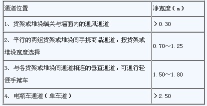第4條 庫內(nèi)存放商品應(yīng)緊湊、有規(guī)律,貨架或堆垛間通道凈寬度應(yīng)符合表3.3.4的規(guī)定。
