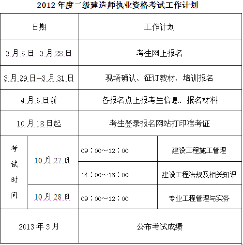 2012年度二級(jí)建造師執(zhí)業(yè)資格考試定于10月27日、28日進(jìn)行,請(qǐng)各有關(guān)單位按照《2012年度二級(jí)建造師執(zhí)業(yè)資格考試工作計(jì)劃》(附件1)的要求,認(rèn)真做好各個(gè)環(huán)節(jié)的考務(wù)工作,確??荚嚬ぷ黜樌M(jìn)行。