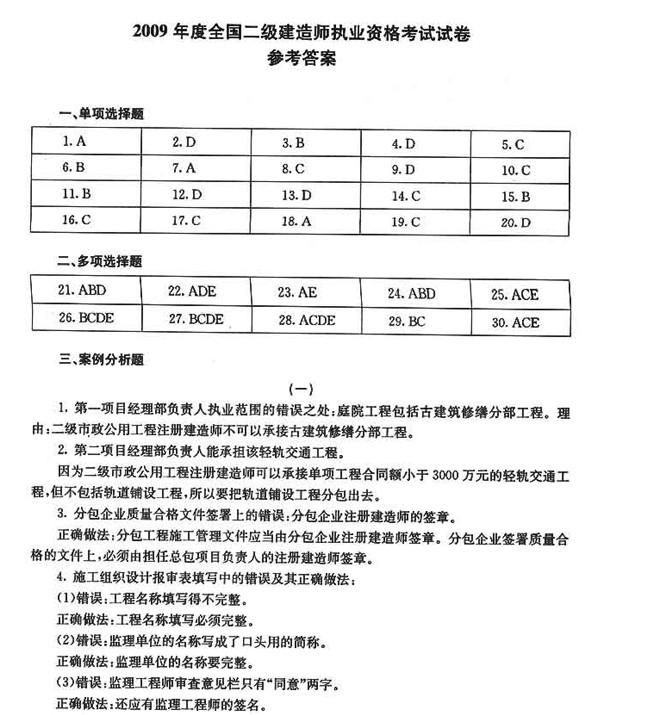 情況二:公司第二項(xiàng)目經(jīng)理部負(fù)責(zé)人是二級(jí)市政公用工程注冊(cè)建造師,承接的是輕軌交通工程,合同金額為2850萬(wàn)元,其中軌道鋪設(shè)工程分包給專業(yè)隊(duì)伍。改項(xiàng)目已處于竣工驗(yàn)收階段。在查閱分包企業(yè)簽署的質(zhì)量合格文件中,只查到了分包企業(yè)注冊(cè)建造師的簽章。