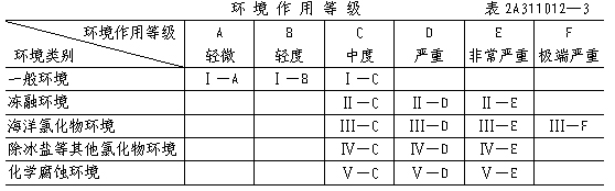 根據(jù)《混凝土結構耐久性設計規(guī)范》(GB/T50476-2008)規(guī)定,環(huán)境對配筋混凝土結構的作用程度如下: