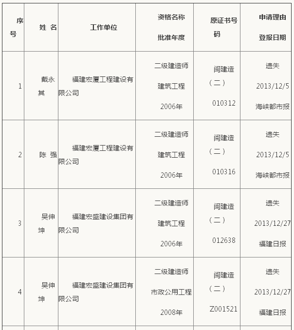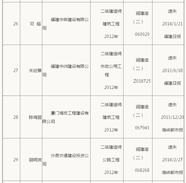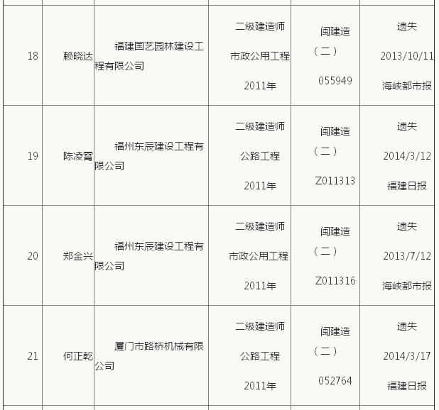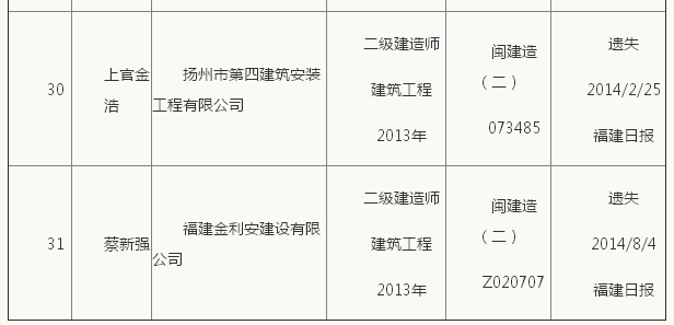 福建二級建造師考試證書補辦公示
