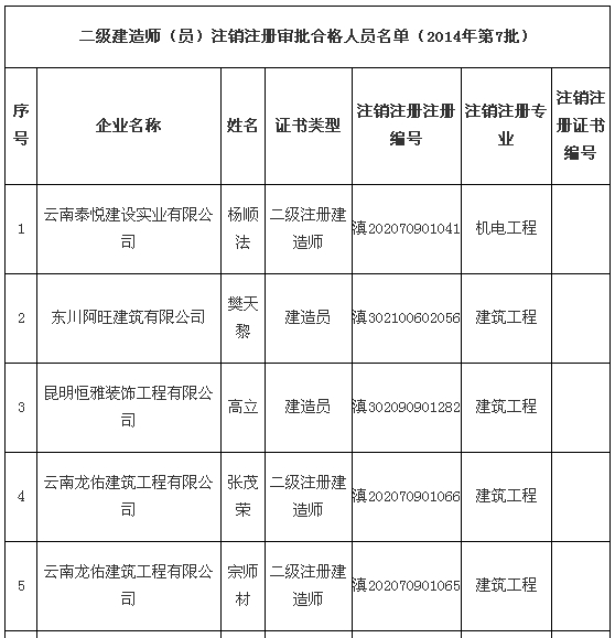 2014年云南第7批二級(jí)建造師注銷注冊(cè)名單
