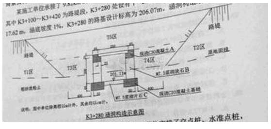 某施工單位承接了9.82km的三級公路路基施工,路基寬8.5m,設計車速40km/h。其中K3+100-K3+420為路堤段,K3+280處設有1-2.5mx2m的蓋板涵,涵洞長度17.62m,涵底坡度1%,K3+280的路基設計標高為206.307m。涵洞構造示意圖如下: