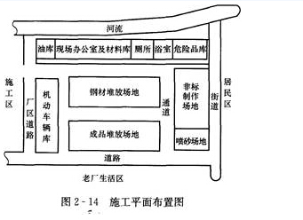 31 A公司總承包某地一擴建項目的機電安裝工程,材料和設備由建設單位提供。A公司除自己承擔主工藝線設備安裝外,非標準件制作安裝工程、防腐工程等均要分包給具有相應施工資質的分包商施工??紤]到該地區(qū)風多雨少的氣候,建設單位將緊靠河邊及施工現(xiàn)場的一所棄用學校提供給A公司項目部,項目部安排兩層教學樓的一層做材料工具工作,二層作現(xiàn)場辦公室,樓旁臨河邊修建簡易廁所和浴室,污水直接排人河中,并對其他空地做了施工平面布置,如圖2~14所示。