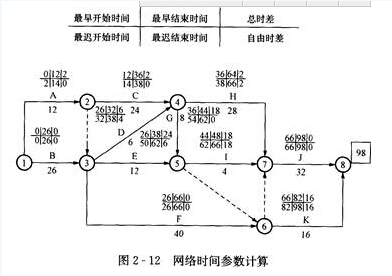 1.根據(jù)圖2-12,原始方案的關(guān)鍵路線和計算工期: