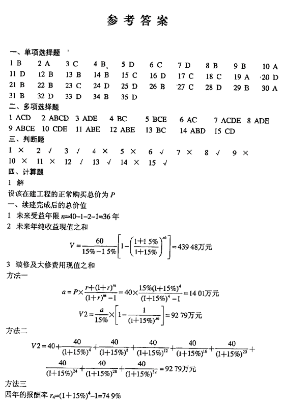 1、某在建工程的土地使用權(quán)是2004年12月31日通過出讓方式獲得的,用途為商業(yè),土地使用期限為40年,土地面積為700平米,容積率為15,土地取得費用為80萬元,已付清。從獲得土地使用權(quán)至正式動工。時問為1年。該工程正常施工期(不含裝修)為2年,建安成本為每平方米建筑面積2300元,管理費用為建安成本的3%.至2007年6月30日已完成主體結(jié)構(gòu),且已投入總開發(fā)成本的55%,剩余費用在施工期內(nèi)均勻投入,折現(xiàn)率為13%。