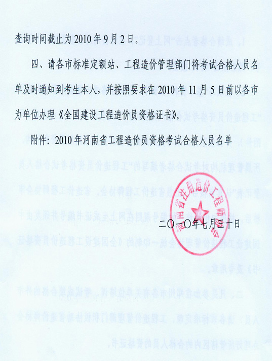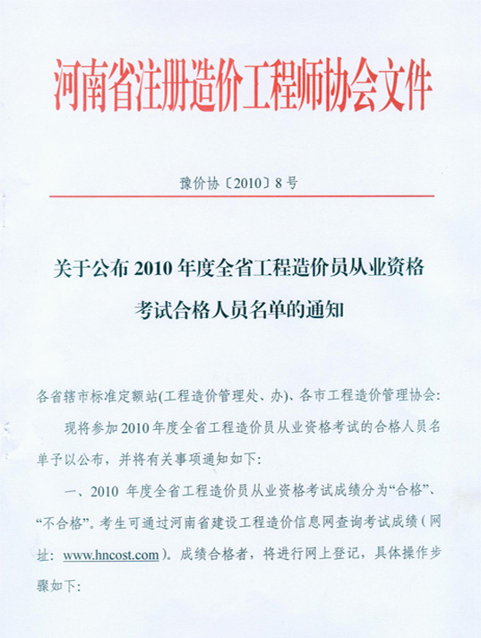 河南公布2010年度造價(jià)員考試合格人員名單的通知