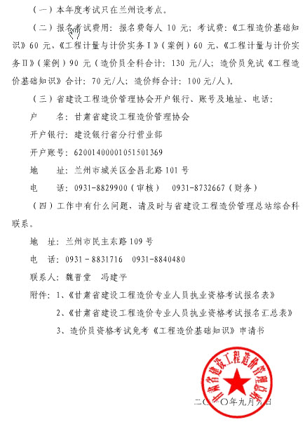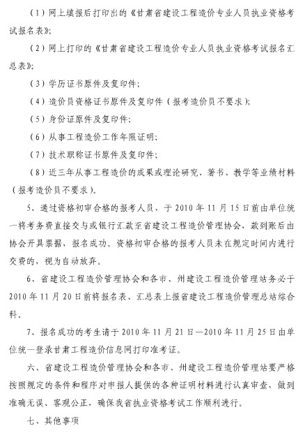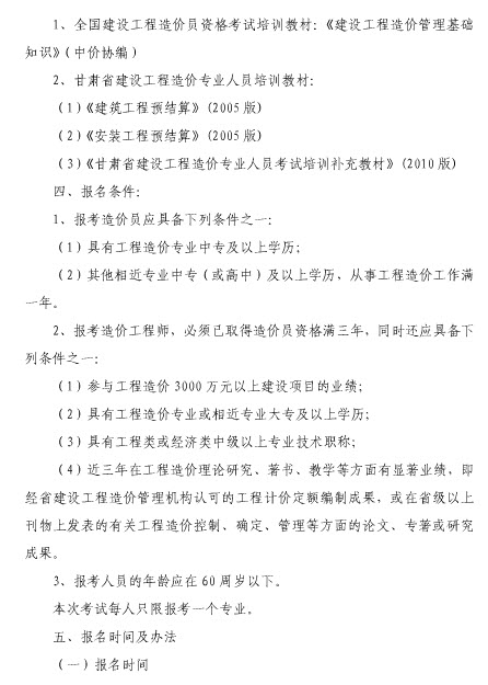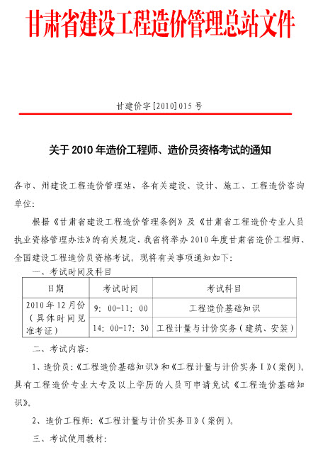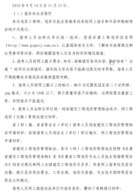 甘肅2010年造價員考試報名時間為9月10-11月15日