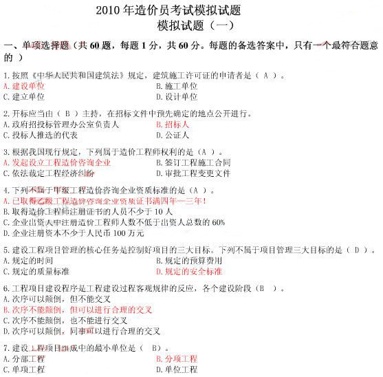 2010年造價員考試考前沖刺模擬試卷一(1)