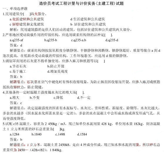 2010年造價(jià)員土建考前沖刺試題及解析一(1)