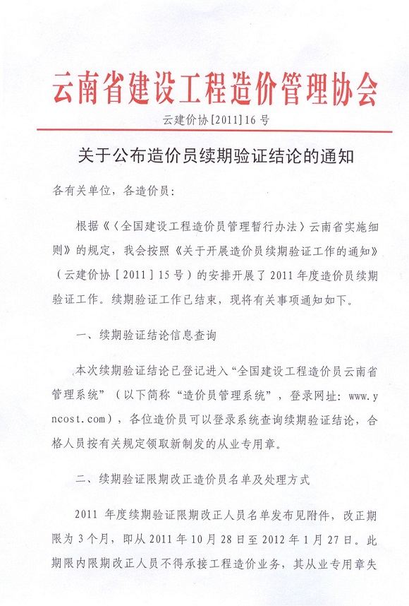 云南2011年造價(jià)員續(xù)期驗(yàn)證結(jié)論的通知