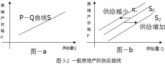 房地產(chǎn)的供給曲線表示房地產(chǎn)的供給量與其價格之間的關(guān)系――某種房地產(chǎn)的供給量如何隨著該種房地產(chǎn)價格的變動而變動。在圖 3-2(a) 中,根據(jù)習(xí)慣,以縱坐標(biāo)軸表示某種房地產(chǎn)的價格(P),橫坐標(biāo)軸表示該種房地產(chǎn)的供給量(Q), 因?yàn)樵趦r格較低時供給量減少,在價格較高時供給量增加,所以我們得到的是一條向右上方傾斜的供給曲線(S) 。如果考慮影響供給量的非該種房地產(chǎn)價格水平因素,那么供給量不再是沿著供給曲線變動,而是整個供給曲線發(fā)生位移。如圖 3-2 (b), 以 S 0為基礎(chǔ),如果房地產(chǎn)的開發(fā)成本上升,整個供給曲線將由 S0向左位移到 Sl;如果房地產(chǎn)的開發(fā)成本下降,整個供給曲線將由 S0向右位移到 S2。在房地產(chǎn)開發(fā)成本下降導(dǎo)致整個供給曲線向右位移的情況下,每一價格水平都有更多的供給量,或者說,對每一數(shù)量水平,房地產(chǎn)開發(fā)商都愿意接受較低的價格。