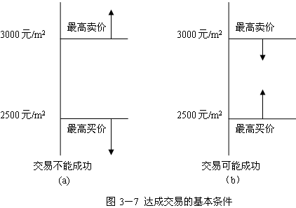 在圖3-7(a)中,因?yàn)樽罡哔I價(jià)低于最低賣價(jià),所以交易不能成功。在圖3-7 (b) 中,因?yàn)樽罡哔I價(jià)高于最低賣價(jià),所以交易可能成功,并由最低賣價(jià)和最高買價(jià)構(gòu)成了成交價(jià)格的可能區(qū)間。賣者和買者通常只知道該區(qū)間中自己的那一端,并都試圖了解對(duì)方的那一端(但通常不成功)。實(shí)際的成交價(jià)將落在這一區(qū)間的某個(gè)位置,至于是剛好為最低賣價(jià)或最高買價(jià)還是在它們之間,取決于買賣雙方相對(duì)的議價(jià)能力和技巧,特別是該種房地產(chǎn)市場是處于買方市場還是賣方市場。買方市場是供大于求、相對(duì)過剩、買方掌握著主動(dòng)權(quán)的市場。