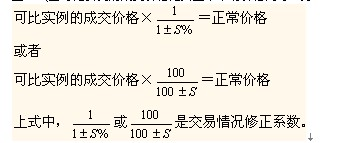 在百分率法中,交易情況修正系數(shù)應(yīng)以正常價格為基準來確定。假設(shè)可比實例的成交價格比其正常市場價格高低的百分率為土S%(當(dāng)可比實例的成交價格比其正常市場價格高時,為+S%; 低時,為-S%),則: