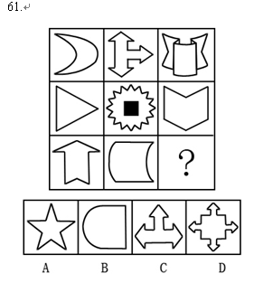 答案:B。解析:在該例題中,9個方格中的圖形都是朝某一個方向外凸的圖形,9個圖形外凸的方向正好沿外邊按順時針方向繞一圈,最后指向中心的一個圖形。因此,正確答案是B。