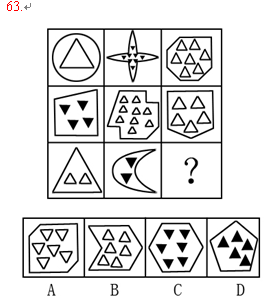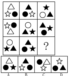 答案:C。解析:每一行的圖形都由3個三角形、3個五角星和3個圓形組成,并且每種圖形以白色、灰色、黑色各出現(xiàn)一次。所以,依據(jù)這一規(guī)律,選C。