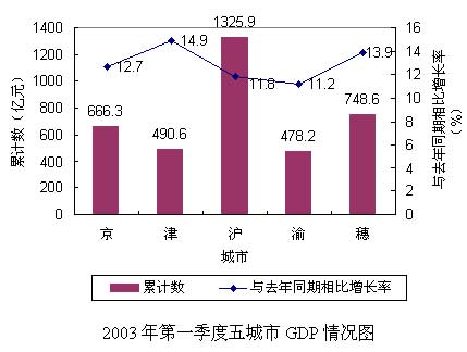?、?2003年第一季度五個城市的GDP總量均實現(xiàn)了兩位數(shù)增長