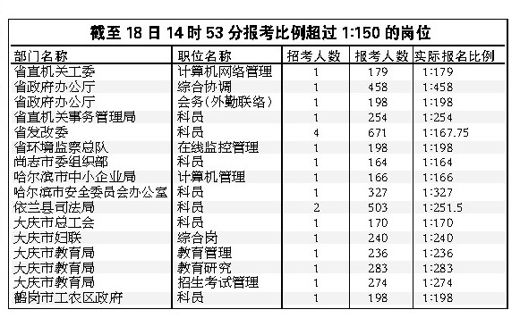 據(jù)省人事廳考錄處的相關(guān)負責人介紹,今年黑龍江省共有723個部門招考公務員2386人。截至18日14時53分已經(jīng)有7萬多人通過黑龍江省人事編制信息網(wǎng)了提交報考信息,其中41515人成功通過審查。當前報考比例達到1∶17.4。省政府辦公廳的綜合協(xié)調(diào)、省直機關(guān)事務管理局的科員等崗位是較為熱門的崗位,報考比例均超過1∶200。