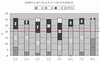 在2008年8月8日至24日奧運會期間,北京市的空氣質(zhì)量不僅天天達標(biāo),而且有10天達到一級。全面兌現(xiàn)了對奧運會空氣質(zhì)量的承諾。下圖是2008年1―8月北京市大氣質(zhì)量檢測情況。圖中一、二、三、四級是空氣質(zhì)量等級,一級空氣質(zhì)量最好,一級和二級都是質(zhì)量達標(biāo)天氣。2008年北京市的空氣質(zhì)量控制目標(biāo)是全年達標(biāo)天數(shù)累計達到256天。