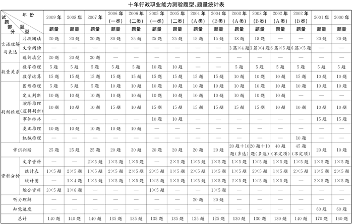 我們首先對(duì)以往十年行政職業(yè)能力測(cè)驗(yàn)的題型與題量分布情況.通過表格形式做一下介紹: