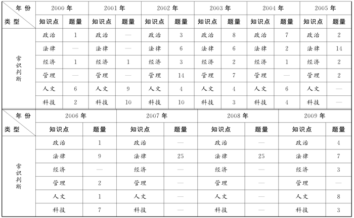 根據(jù)對(duì)行政職業(yè)能力測(cè)驗(yàn)2000年~2009年十年真題的分析與研究,常識(shí)判斷部分的命題情況如下表: