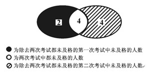 【解析】B。兩次考試都沒有及格的人數(shù)=學(xué)生總數(shù)-兩次都及格的人數(shù)-第一次未及格的人數(shù)-第二次未及格的人數(shù)=32-22-[32-22-(32-26)]-[32-22-(32-24)]=32-22-6=4。